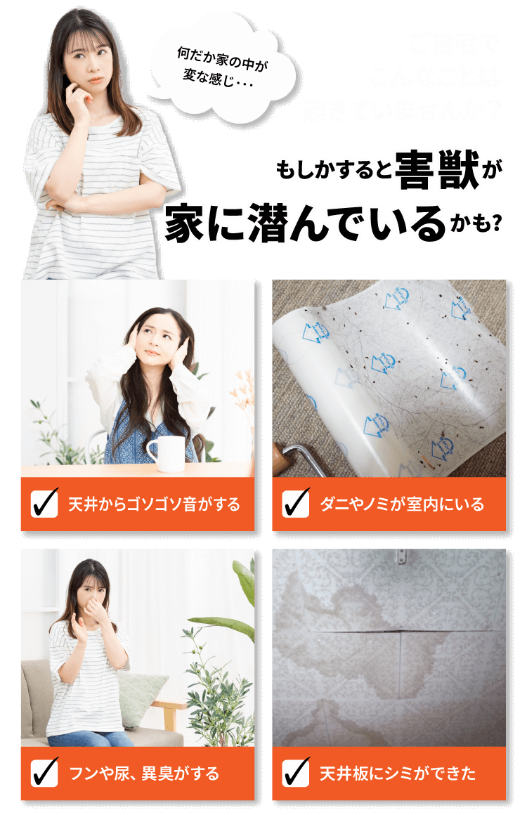 被害の状況を確認した上で、駆除方法の検討とお見積りご案内いたします。その際、お客様のご要望もぜひお聞かせください。